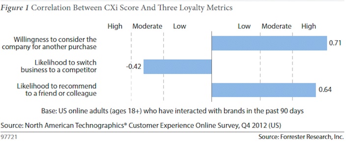 Forrester then calculated a Customer Experience Index (CXi) based on the results from the survey. They reported a high correlation between their CXi results and Loyalty (additional revenue, lower churn) and the tendency to recommend.