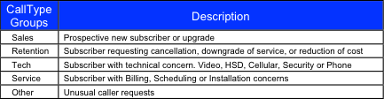 CallType is a measure of caller contact motive. It is determined by the caller, not the queue (e.g. callers will use an acquisition phone number to report a service or technical concern, resulting in inaccurate performance and service statistics.)